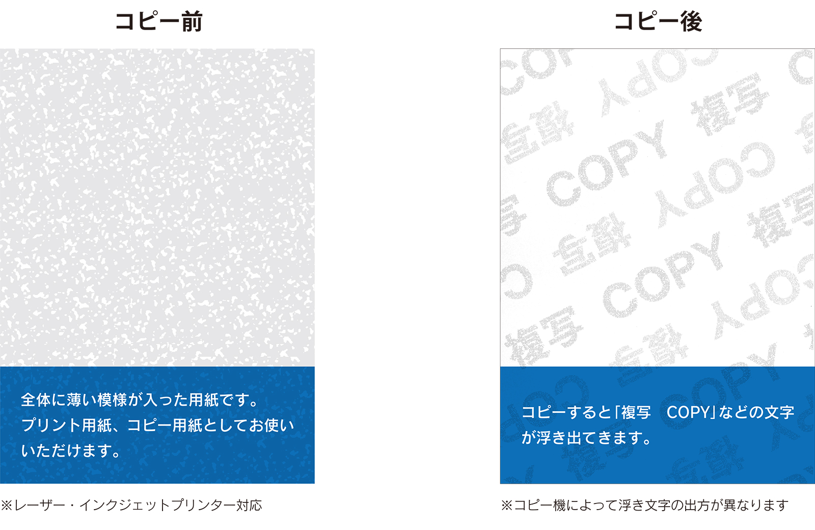 原本とコピーが一目で判別でき、重要な書類等の複製、偽造を防ぐ効果があります。